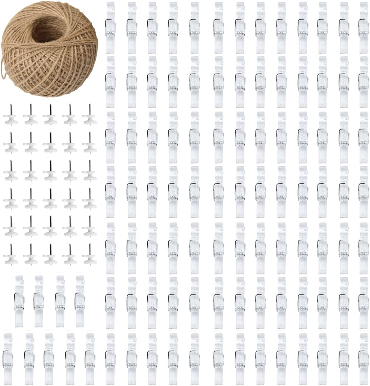 100pcs Photo Clips Mini Clothespins for Photo Wall Hanging Dorm Decor Picture Polaroid Kids Artworks Display with 98ft Twine String & Mini Wall Mount Non-Mark Hooks