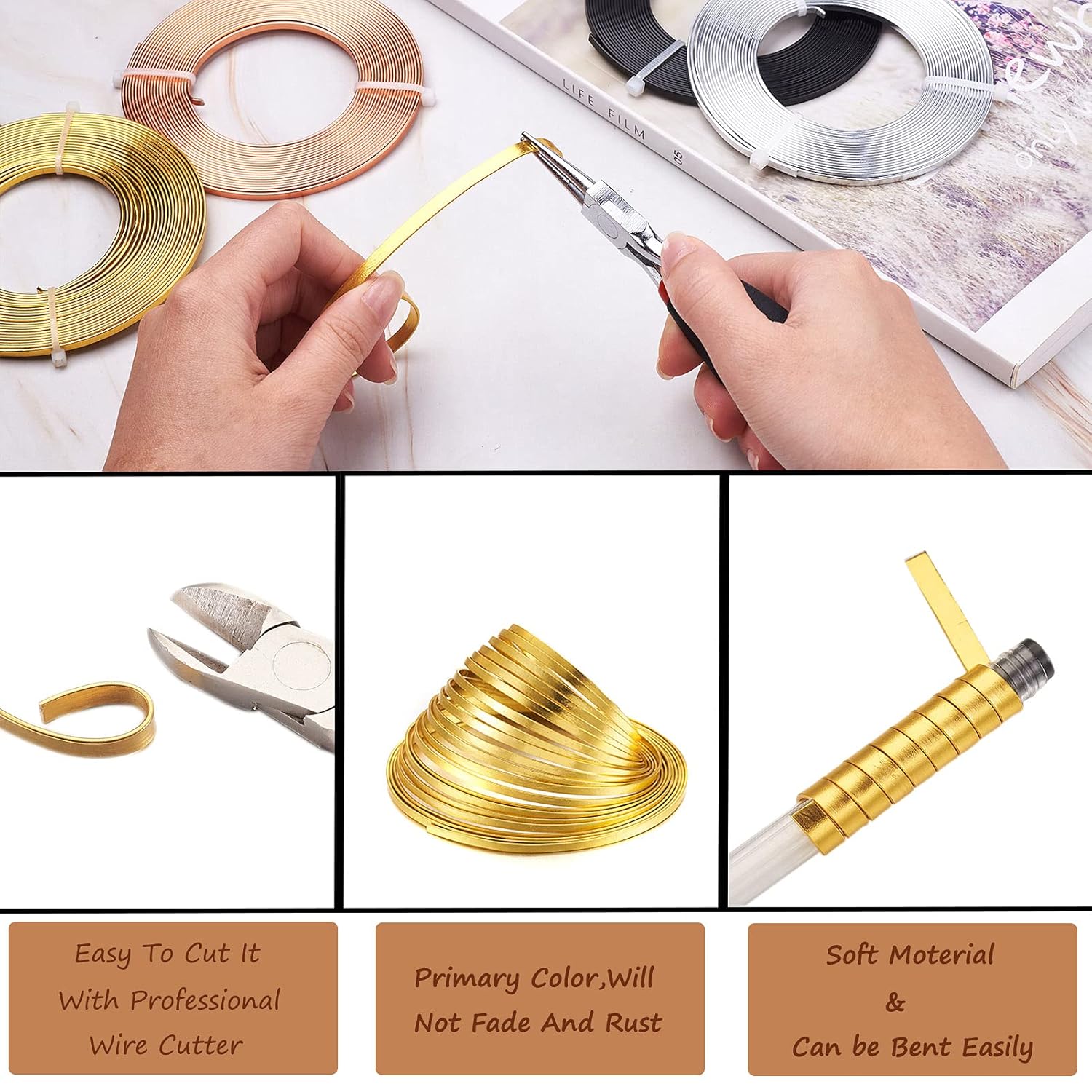 - 【Premium Material】Crafting wire is made of malleable yet durable aluminium, perfect for wrapping, bending, and shaping. It can be easily hammered and stamped. They feature with 4 rich colors for selection, the bright and fine anodized color does not flake off when being bent or smashed as long as coated tools are used.