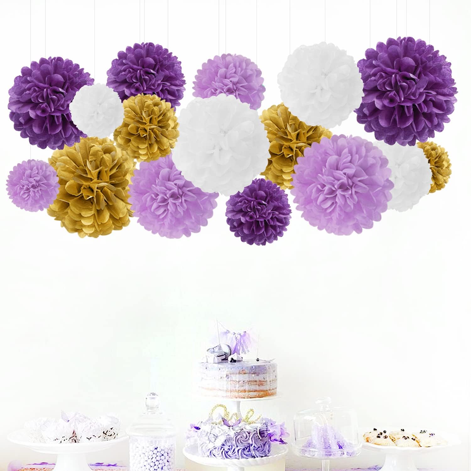 - 【Paper Balls Party Decorations】The pastel party decorations kits include 16pcs tissue paper flowers: 4pcs 6" ,4pcs 8" ,4pcs 10",4pcs 12"in the color of purple white gold lavender tissue pom poms.