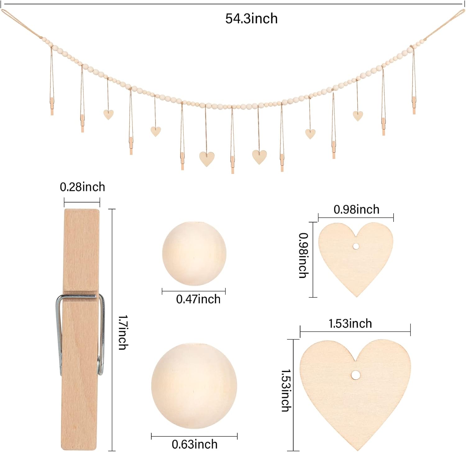 - Product Size: The total length of wood bead garland is 54.3", the wooden beads in 2 sizes, the diameter of beads is 0.47", 0.63", the wooden Hearts Tags in 2 sizes, (Diameter 0.98" and 1.53"), It is long enough to fit any home decor and bring a cozy bohemian touch to adorn your living room, bedroom, fireplace and more