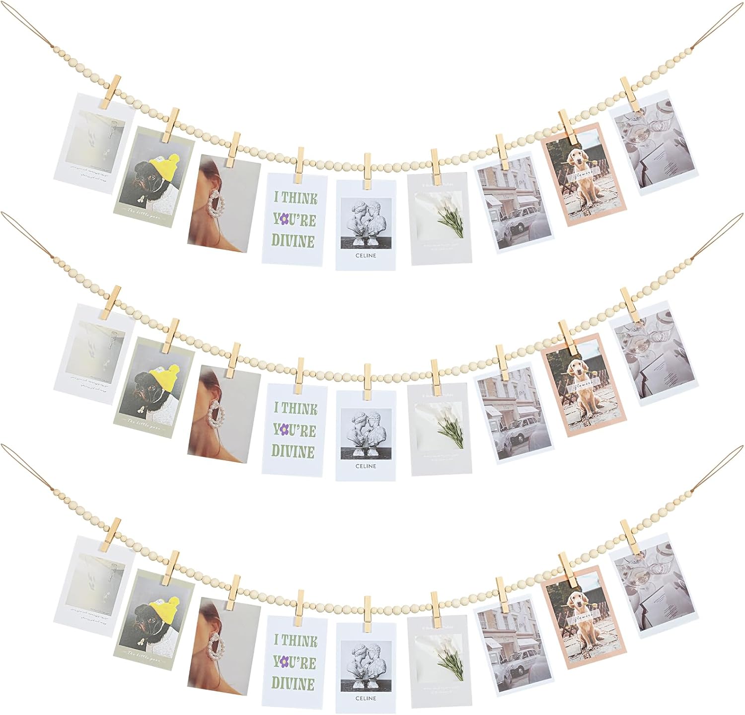 Hanging Photo Display Wall Decor, 3PCS Boho Wooden Bead Garland Collage Picture Frame with 9 Wood Clips for Bedroom, Living Room, Office, Dorm Decor, Photos Holder Teen Girl Gifts
