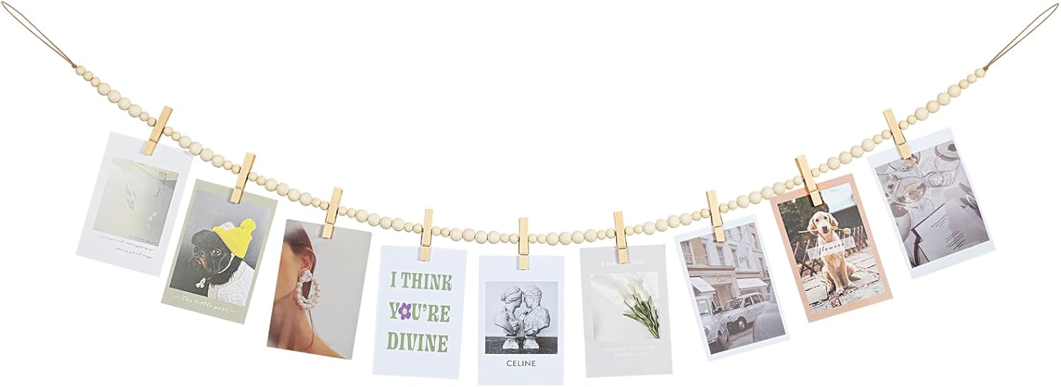 Hanging Photo Display Wall Decor, Boho Wooden Bead Garland Collage Picture Frame with 9 Wood Clips for Bedroom, Living Room, Office, Dorm Decor, Photos Holder Christmas Cards Teen Girl Gifts