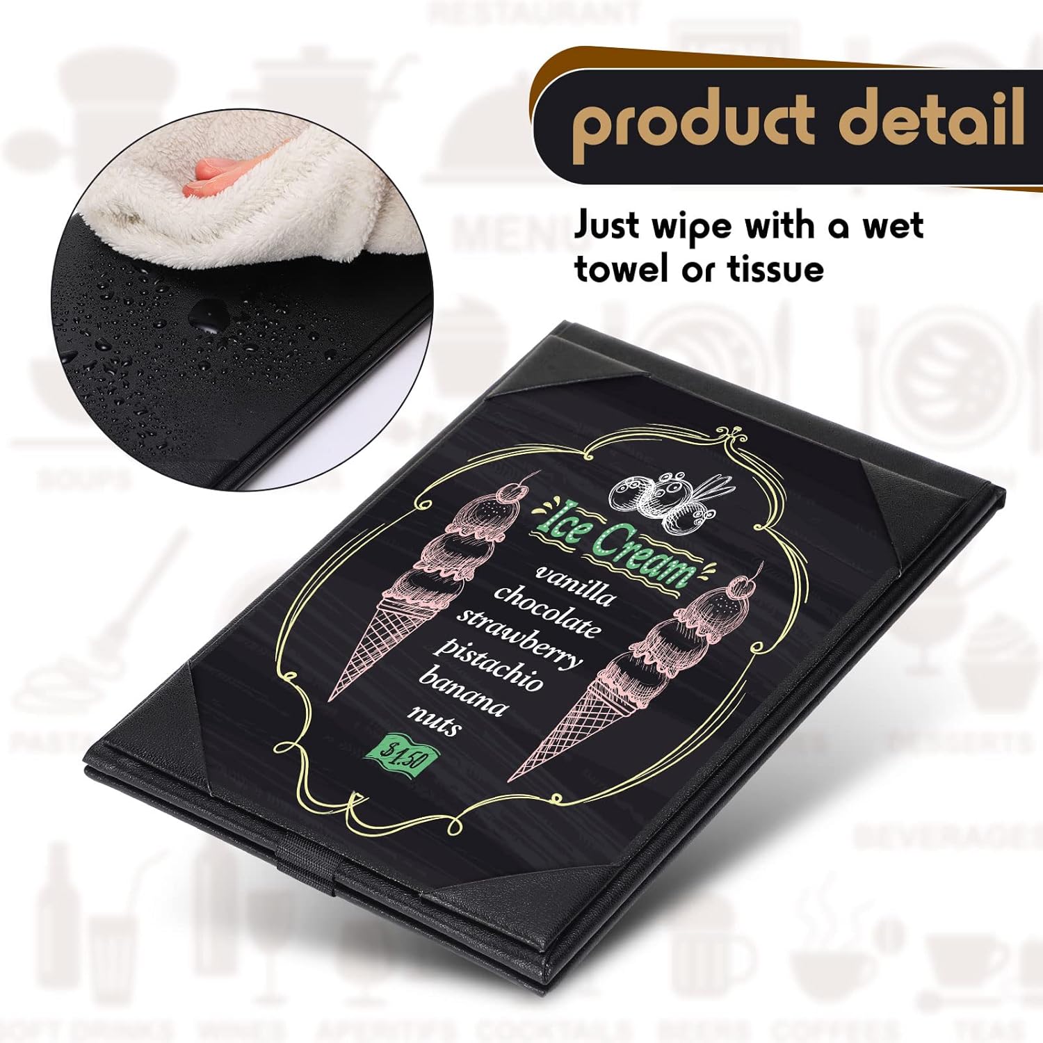 - Double Sided Foldable Design: each table tent comes with two viewing sides, helps you to feature twice the content for saving space; With the ribbon, both panels connected and supported while in use; Menu cover can be folded when no use for easy storage
