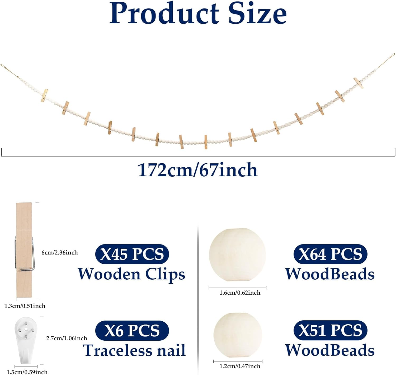 - 3 Pcs Boho Wood Beads Garland Size: The total length of the photo wall display is 67 inches. It features wooden beads of different sizes, with bead diameters of 0.47 inches and 0.63 inches, totaling 80 wooden beads. It is long enough to fit any home decor and makes a lovely addition to walls, shelves, beside mirrors, over fireplaces and sofas,and more.