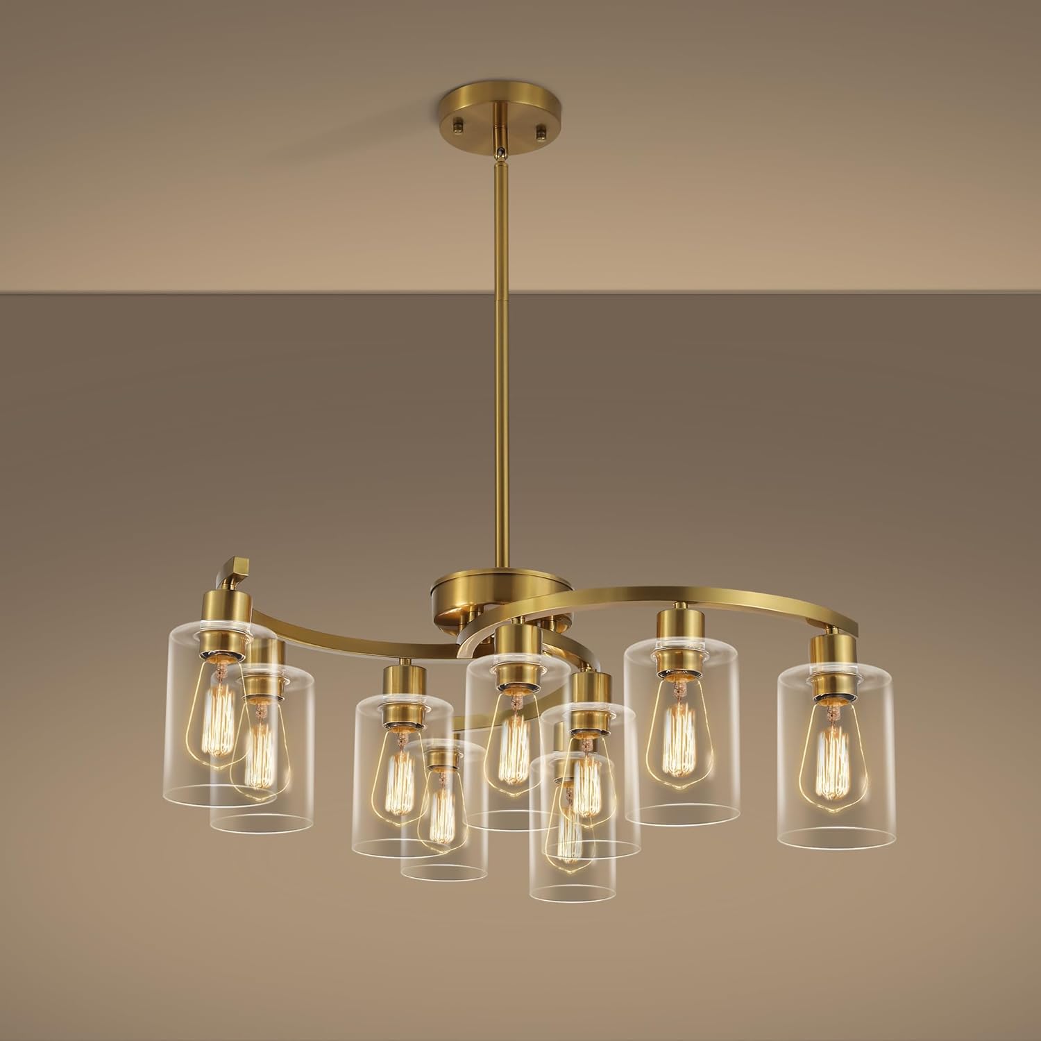 9-Light Gold Glass Chandelier, Adjustable Height Dining Room Light Fixtures Over Table, Contemporary Hanging Chandelier for Kitchen Island Living Room Foyer Office, Clear Glass Shade
