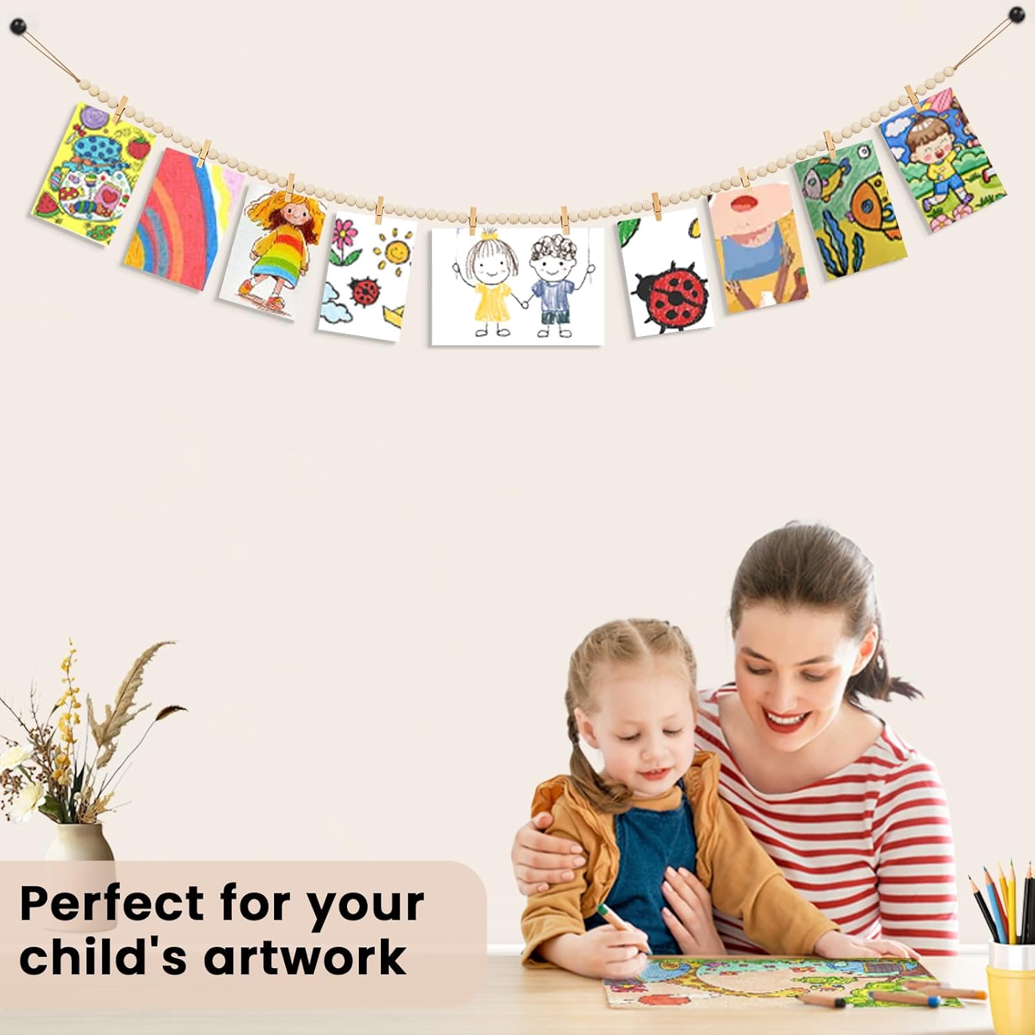 - This hanging photo display is hand-made with natural wooden beads and jute rope, durable, corrosion-resistant and non-toxic, not easy to break and fade. Natural wood beads have a polished finish that is smooth. You can paint and color it to complete your personalised decoration.