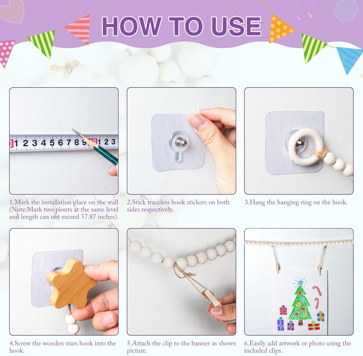 - Package: Total length of wooden bead garland: 59". It is equipped with 40 wooden clips(12 single clips+28 double head clips), 2pcs Wooden stars hook, 2pcs Traceless hook sticker, 2pcs Hardwall hanger garland which can show many children's artworks