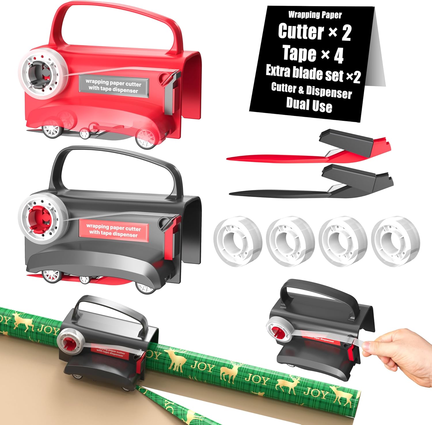 - Dual Function Cutter & Tape Dispenser Revolutionize gift wrap paper wheel cutter sliding! Effortlessly cut wrapping paper rolls and dispense clear tape. Includes 2 cutters, 4 transparent tape refills, and 2 capped blades. Roller-glide tech enables smooth cuts for Christmas gifts and birthdays. Supplies support ~1,000 boxes – ideal for gift wrap storage at home or shops.