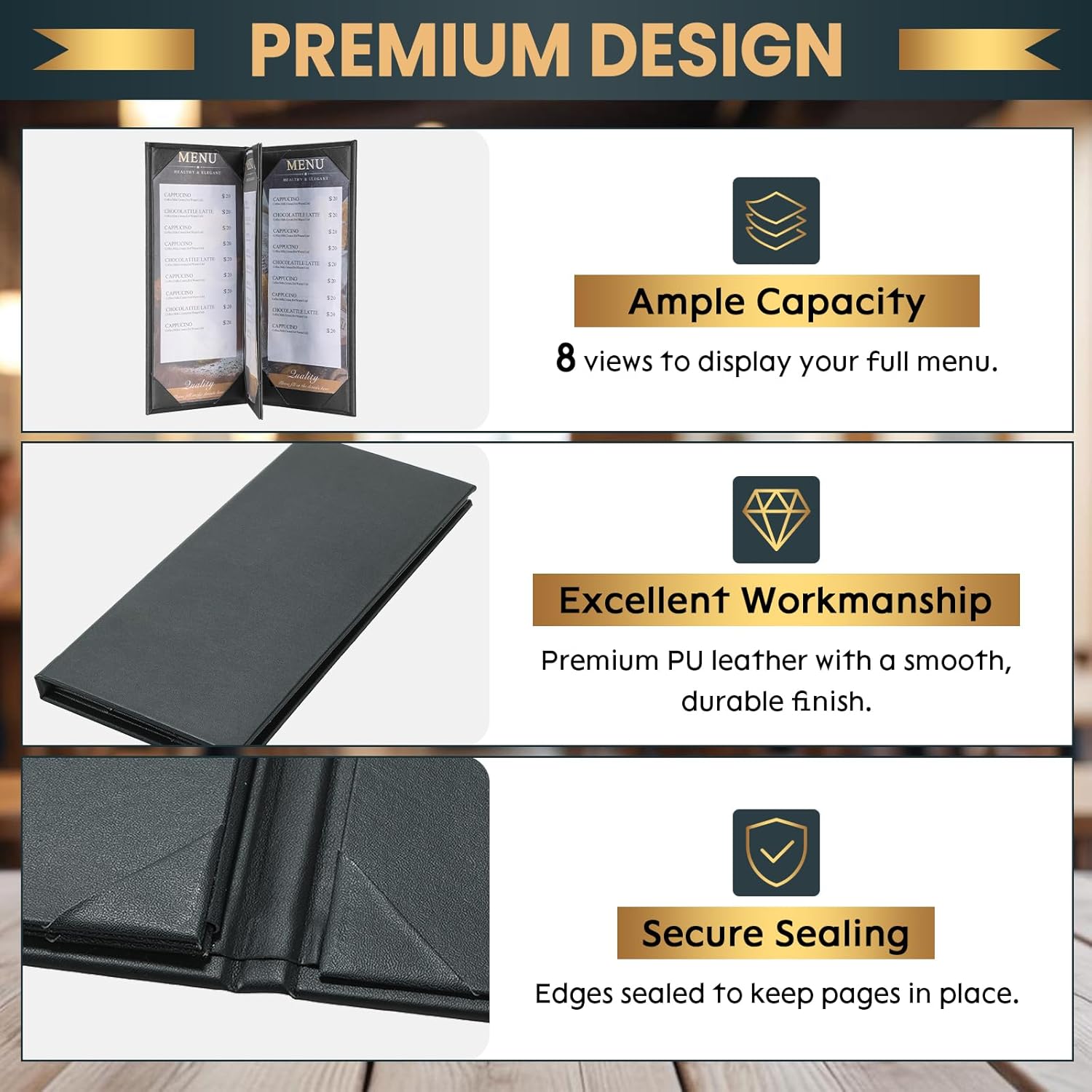 - Premium Material: Our 4.25" x 11" menu covers are made of high quality PU leather for great durability. The top quality material is smooth and soft to the touch, with no unpleasant smell.