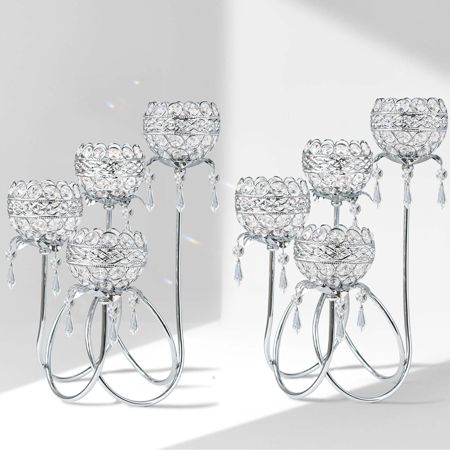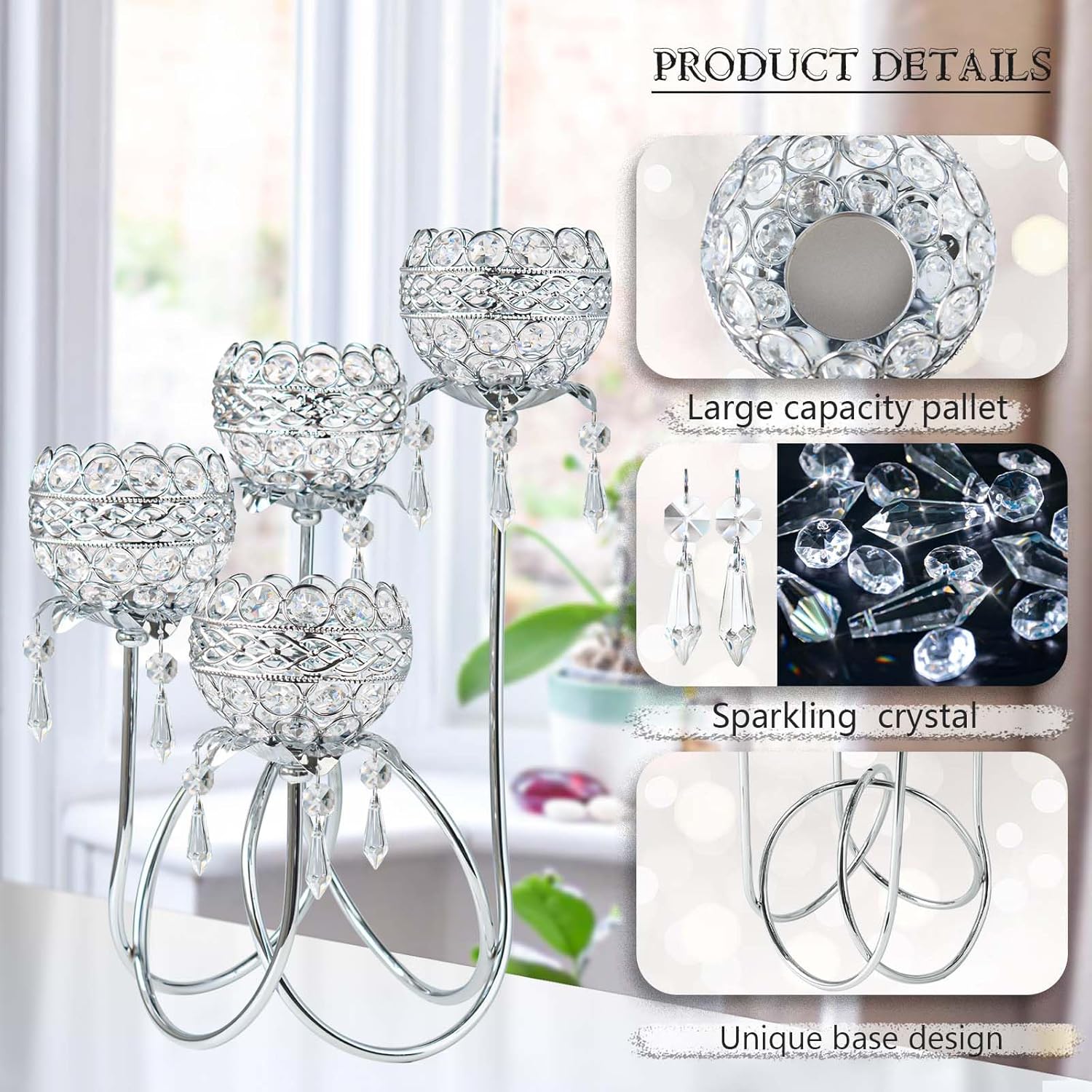 4 Arms Crystal Candelabra Tealight Holder - Tall 15.7 Inch Elegant Tabletop Centerpiece with Crystal Pendant Bowls & Artistic Metal Stand for Wedding, Dining Table, Home Decor (2, Silver)