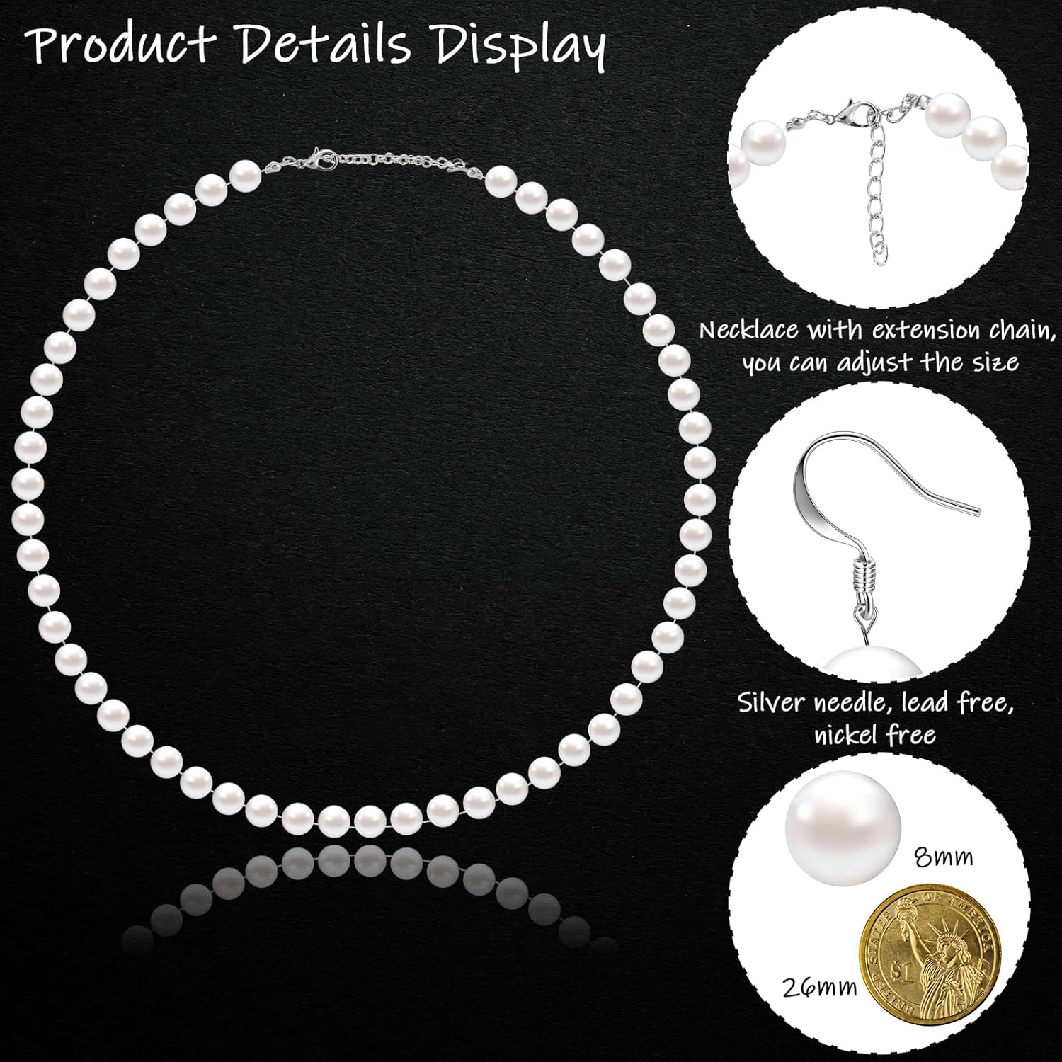 - Quality and Material: the pearls are ABS highlight pearls, each pearl is 8 mm in diameter, artificial imitation, not real pearl, the silver clasp of the pearl necklace and the silver needle of the earring are silver, can be worn for a long time, and won't burden your ears, easy to put on and take off