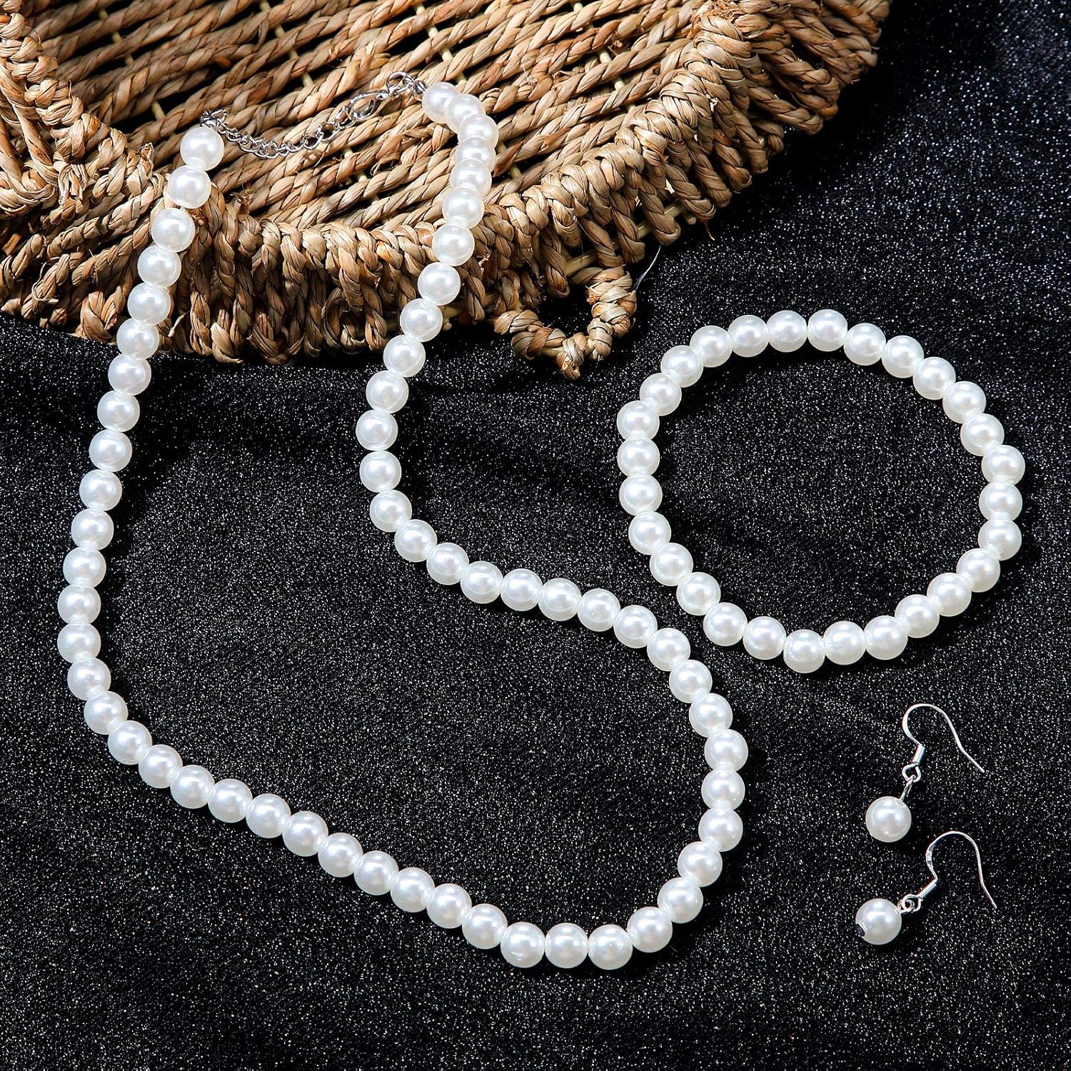 - Faux Pearl Jewelry Set: the faux pearl jewelry set includes 1 pearl necklace, 1 elastic beaded bracelet and 1 pair of pearl earrings, the necklace measures approximately 18 inches, the bracelet is 7.9 inches long, a set of matching pearl jewelry is worthy of your favor