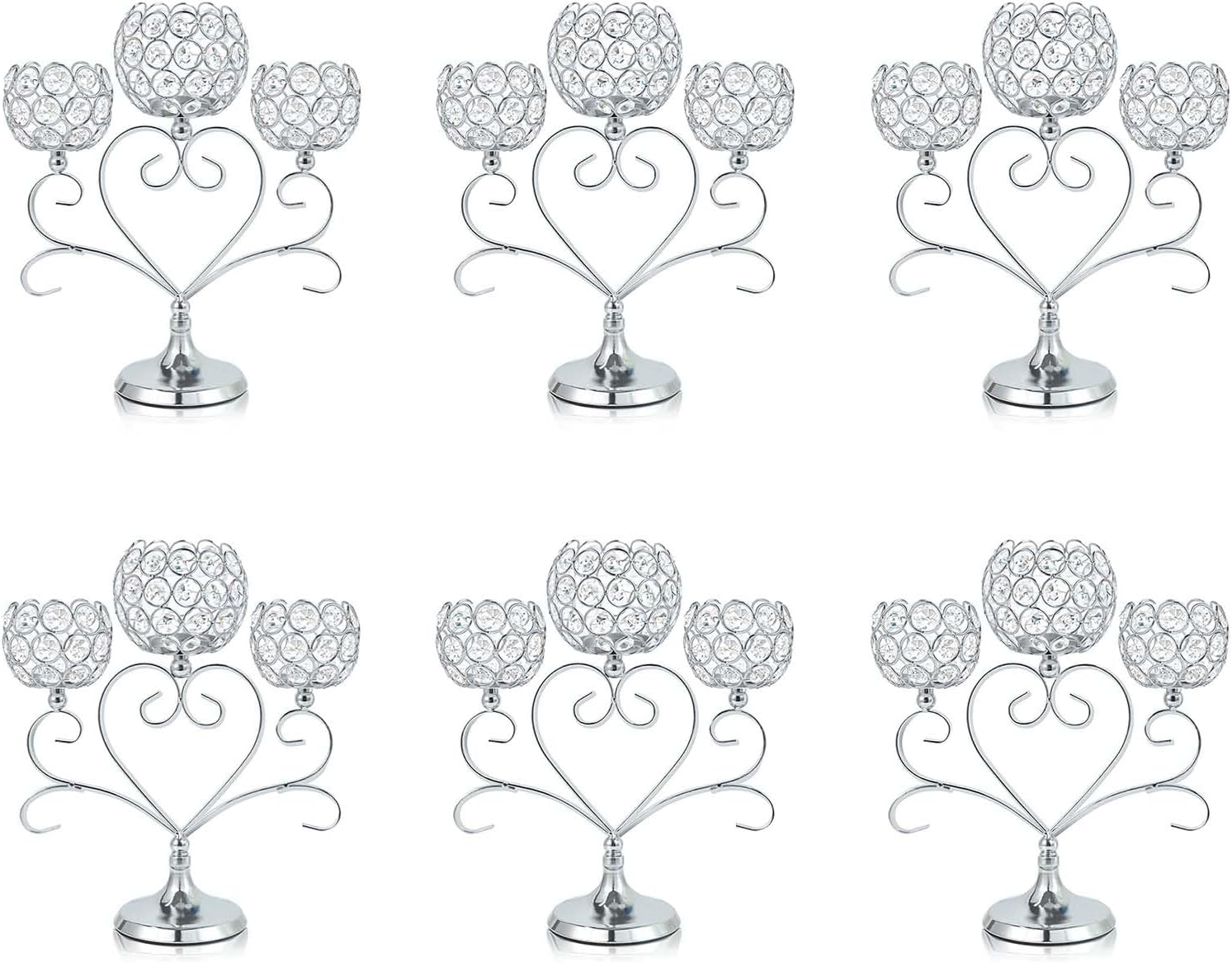 6 Pcs Silver 3-Arm Heart Tea Light Candle Holder - Crystal & Metal Wedding Centerpiece Decor, Sparkling Table Decor for Anniversaries/Romantic Tabletop Home/Dinner Party/Events